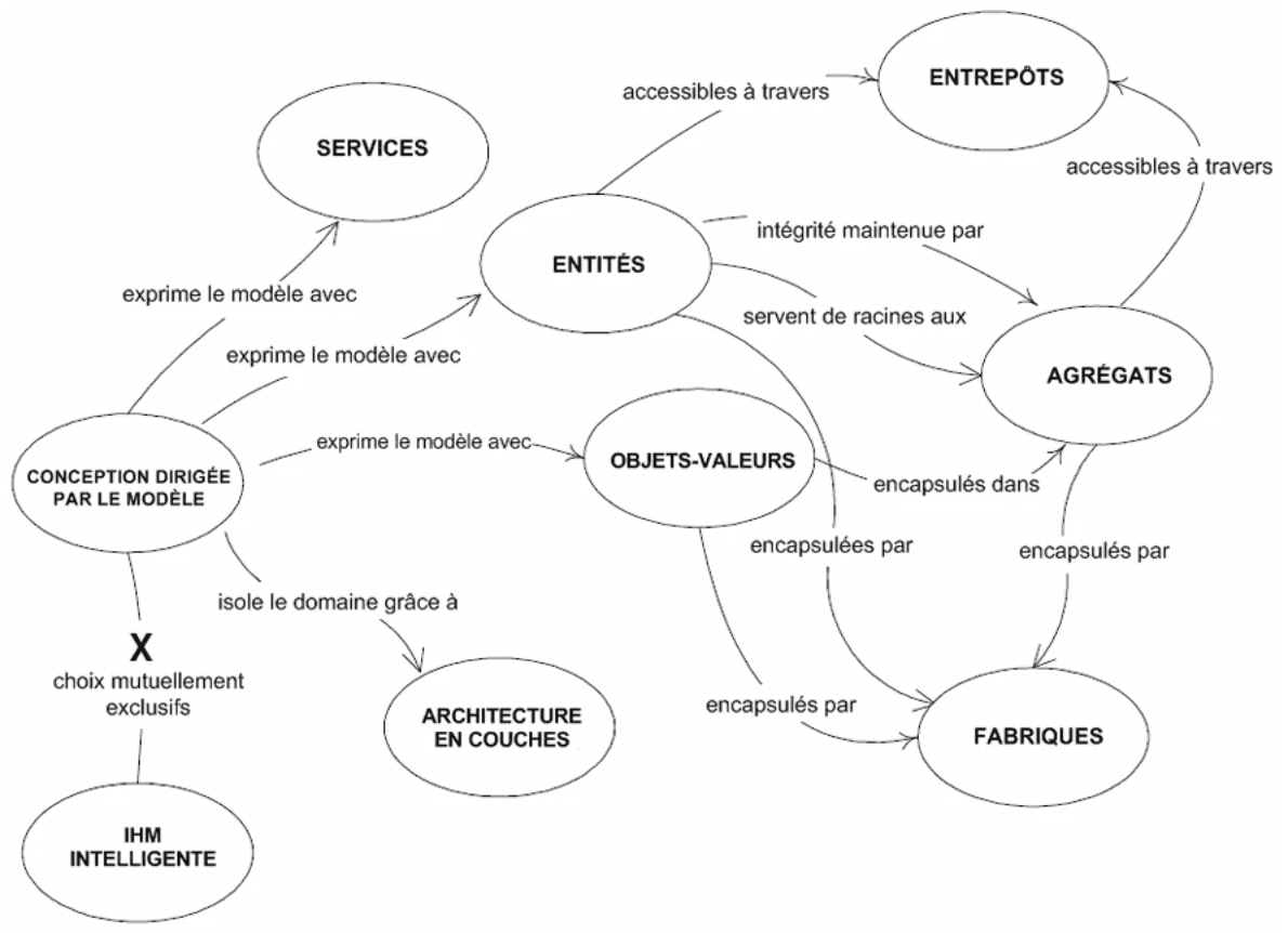 Ci-dessous le diagramme extrait de l’excellent livre DDD Vite Fait (Domain-Driven Design Vite fait - InfoQ) résumant les interactions des éléments de DDD.