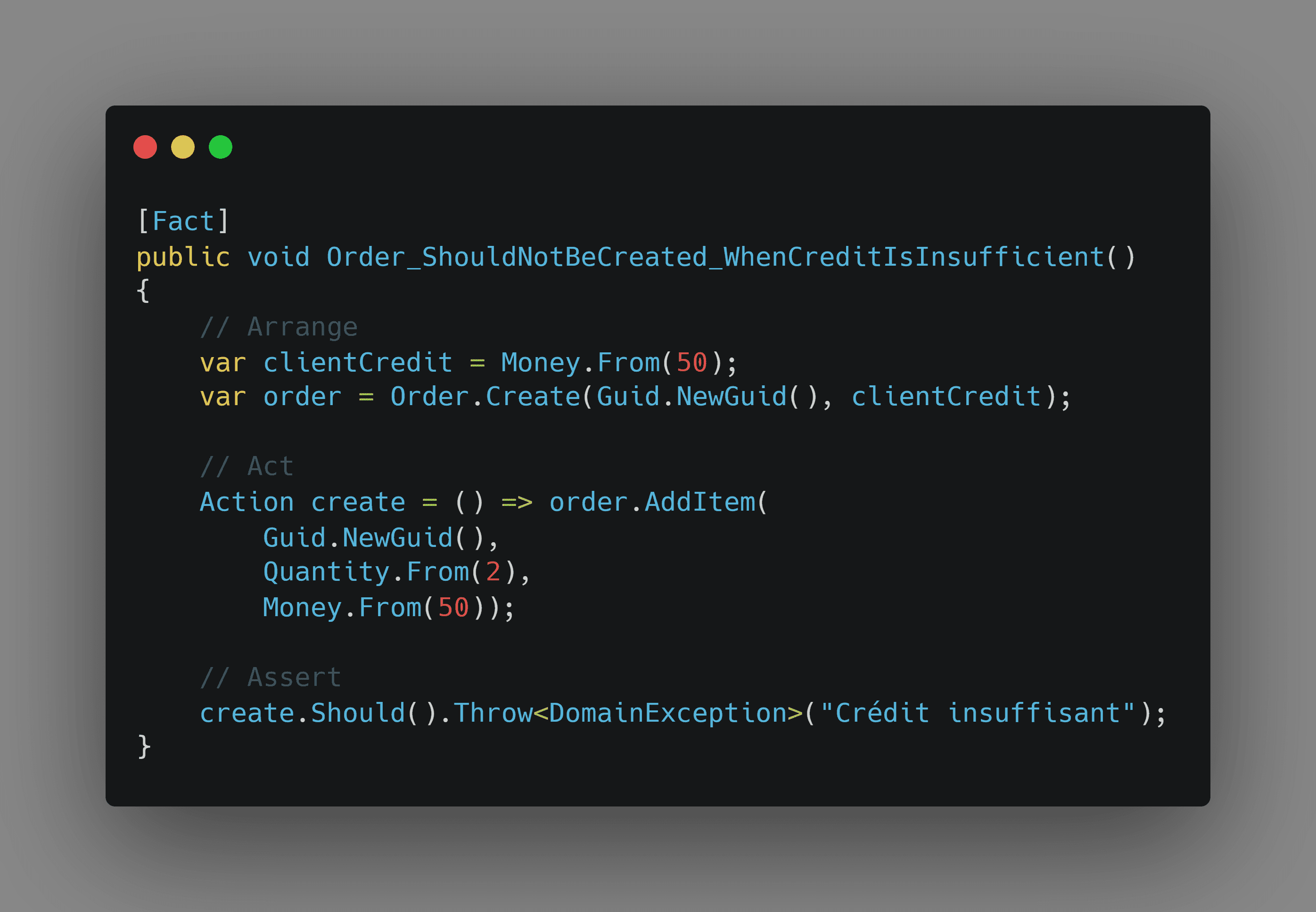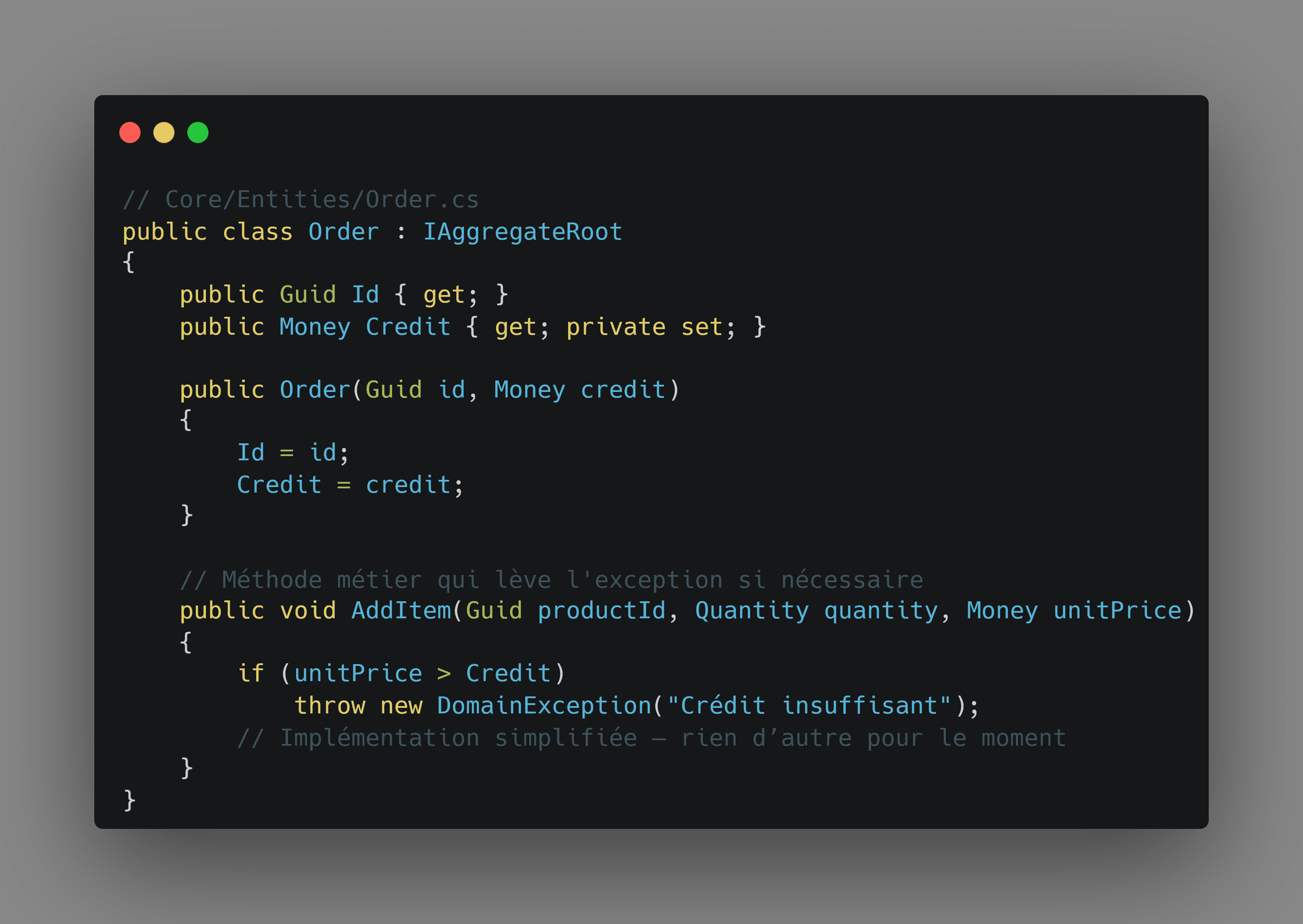 Nous allons illustrer le TDD appliqué à la couche Domain d’une application fictive de gestion de commandes pour une boutique en ligne.