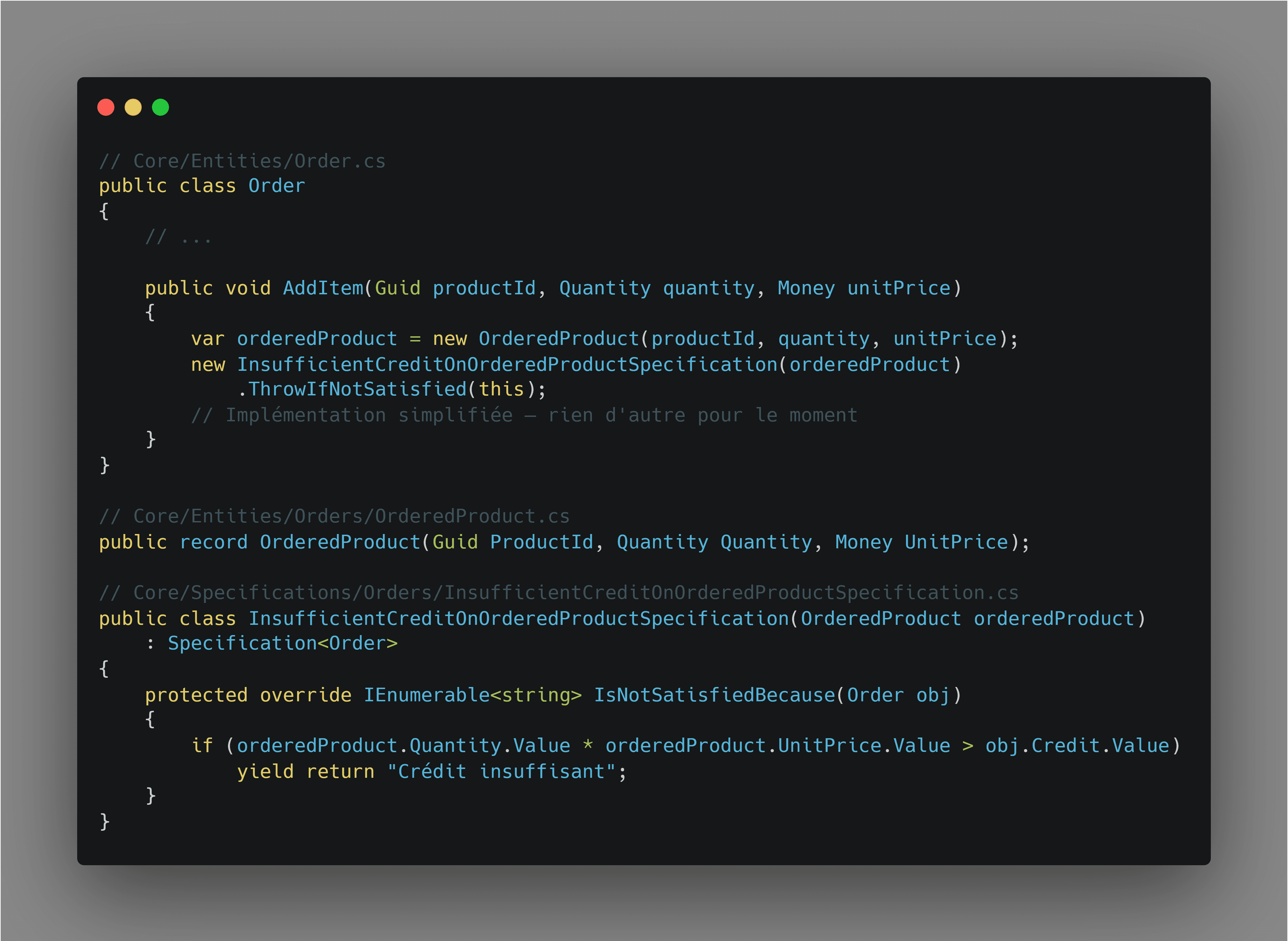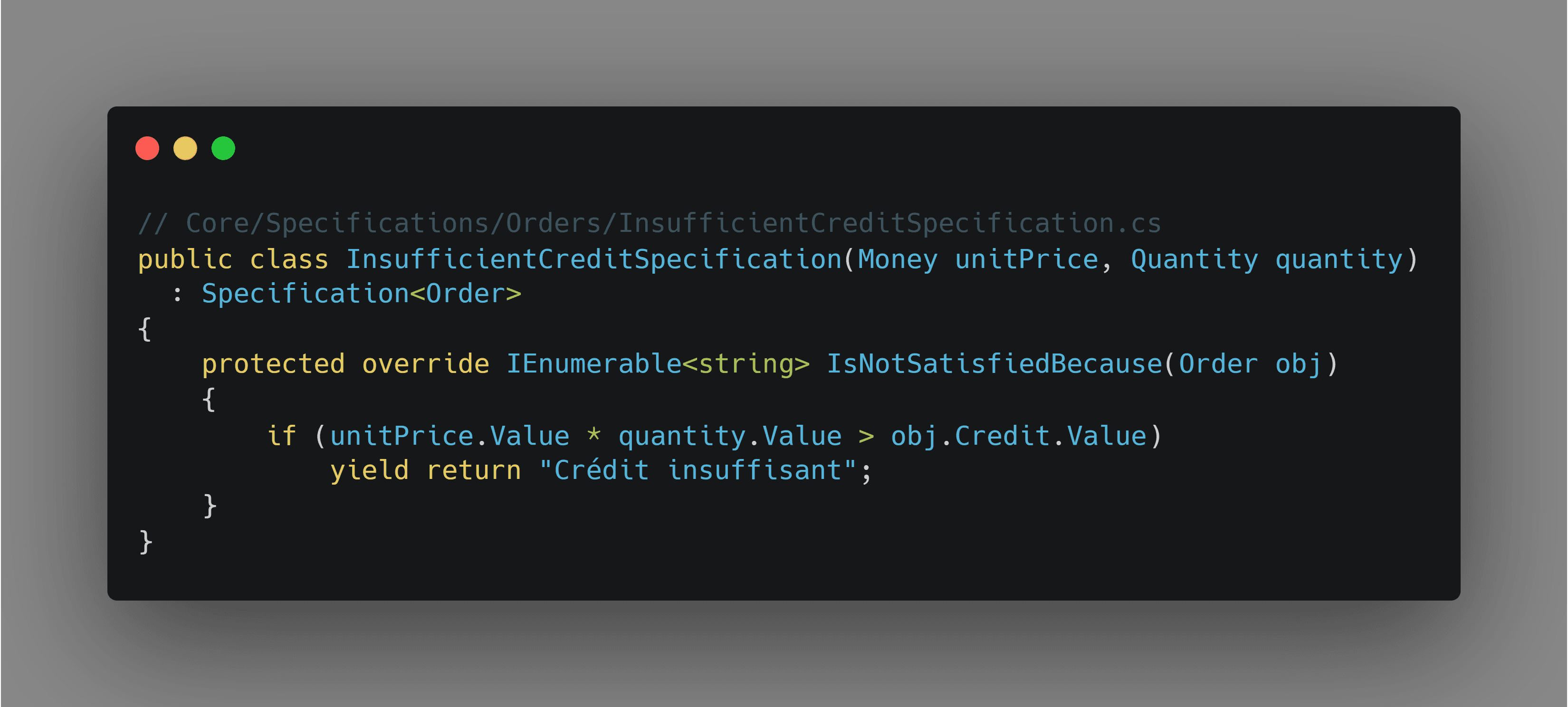 La définition d’une spécification permet de formaliser la règle métier en respectant le Single Responsibility Principlemême si, dans ce cas précis, ce serait tomber dans l’over engineering. Mais dans un projet d’envergure, ce pattern peut rendre le code plus lisible et plus maintenable.